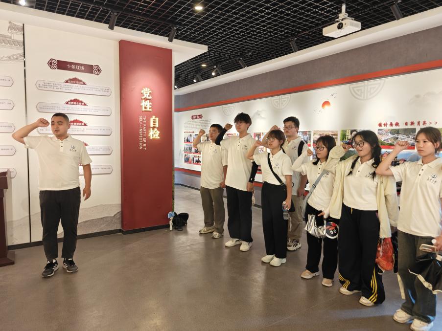 党员党性教育基地,通过资料图片、文字记载以及人物故事学习红色事迹,感悟红色精神。在党旗前,指导老师杨海城带领团队成员重温入党誓词,以铮铮誓言砥砺初心,为意义非凡的首日实践画上圆满句号。
