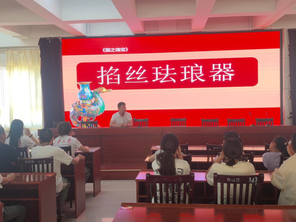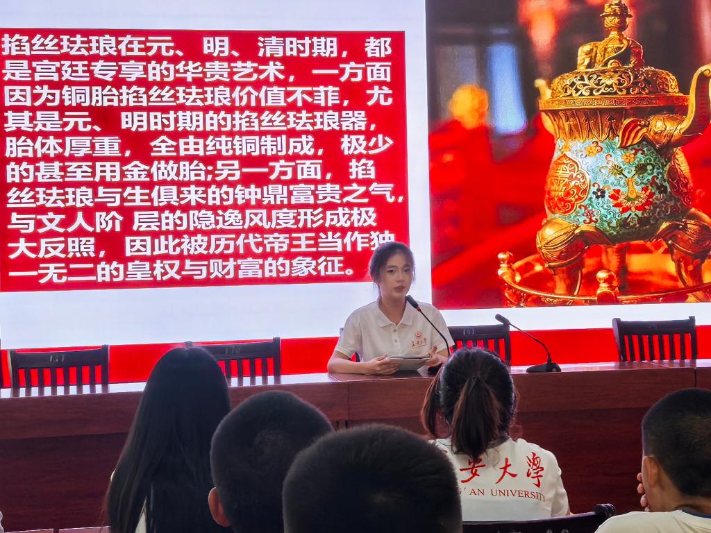 实践队队员王尧系统讲解了掐丝珐琅(又称景泰蓝)的历史渊源,着重强调其作为丝绸之路文明交流互鉴的生动见证。 该技艺于元代经陆上丝绸之路传入中国,其雏形带有鲜明的西域与波斯风格。 在随后的明清两代,中华工匠在吸收外来技艺精髓的基础上,融入本土审美与工艺智慧,进行了创造性转化与创新性发展,使其纹饰、釉彩和意蕴深深烙上中华文化印记,最终发展成熟为独具东方神韵的国之瑰宝。 王尧阐明,掐丝珐琅从“舶来技艺”到“中华国粹”的升华历程,正是历史上各民族交往交流交融、共同创造灿烂中华文化的缩影,其本身即是中华民族多元一体、兼容并包特质的物质载体,对于今天理解与铸牢中华民族共同体意识具有深刻的历史启示意义。