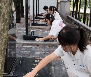 (实践队在烈士纪念碑前默哀) (实践队擦拭烈士墓碑)