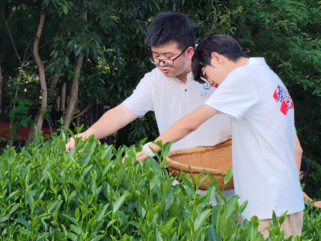 (实践队员进行采茶体验) (实践队成员体验制茶)