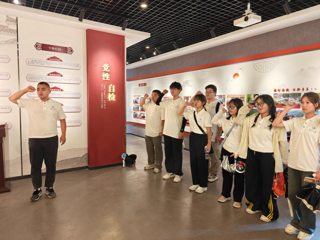 次日,实践队首站抵达青山镇。在青山绿水现代农业园区内,队员们深入菌棒车间、踏足灵芝大棚,亲眼见证“药食同源”如何将朽木化为宝贵资源;在光伏板下,大家深切体会“农光互补”立体模式的绿色脉动。随后,在党性教育基地,指导老师杨海城引领团队成员重温入党誓词,青春的誓言在青山之巅久久回荡。