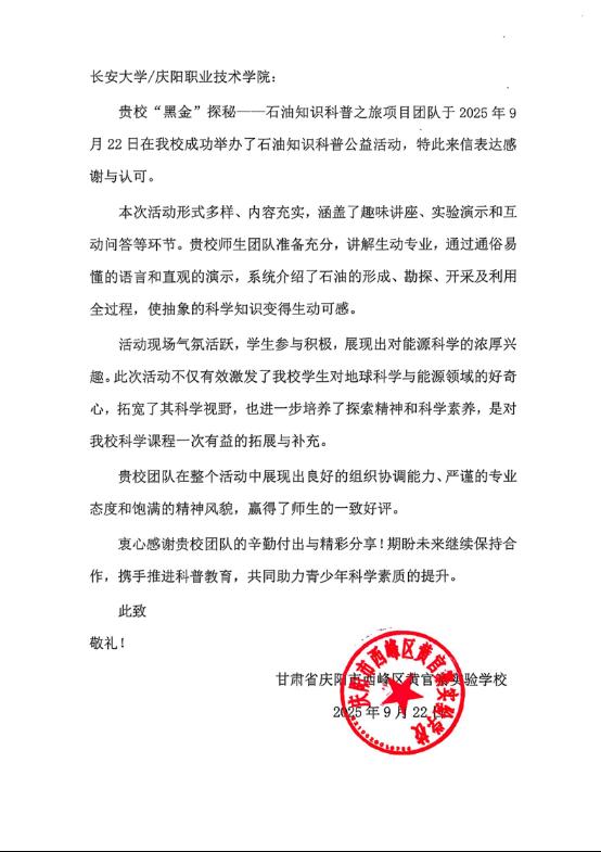 专门发来感谢信,对活动的组织成效与师生表现予以充分肯定。信中表示,本次活动“形式多样、内容充实、讲解生动专业”,使抽象的科学知识更易于理解,不仅激发了学生对地球科学与能源领域的兴趣,也有助于拓宽科学视野、培养探索精神与科学素养。来信特别提到,无码av影片
