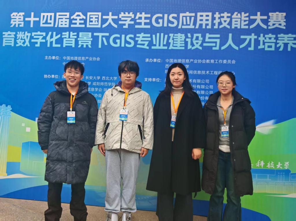 和土地无码av影片的四名学生(张凯洋、刘天昊、吴烨楠、张梦茹)联合组队,在指导教师赵建林和吴田军的携手带领下,在首届全国大学生GIS应用技能大赛陕西省邀请赛中荣获特等奖,并在此次全国大赛中荣获二等奖。