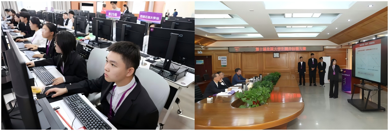 师生沉着应战、稳定发挥。本科生代表队在测井资料处理解释实操、测井仪器辨识、地质标本鉴别及成果答辩等环节表现优异;研究生代表队围绕多井区块评价开展深入研究,成果汇报逻辑严谨、论证充分,答辩环节思路清晰、应答得体。