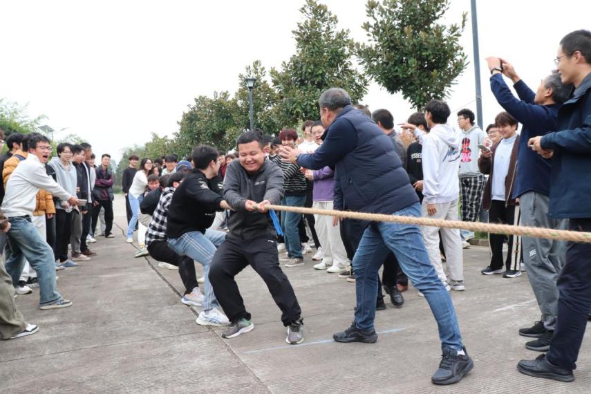 随后,实习基地组织了师生拔河比赛,学生们以班级为单位,组成8支队伍同台竞技,现场气氛热烈,队员们紧握长绳,身体后倾、脚步稳扎,展现出饱满的斗志与协作精神。生态地质 104 班凭借默契的配合与顽强的毅力,在多轮较量中一路过关斩将,最终成功斩获拔河比赛冠军。比赛尾声,校领导与老师们与生态地质104班的队伍进行比赛,与同学们一同拉起长绳。师生同心协力的身影成为实习基地最温暖的风景,不仅延续了比赛的欢乐氛围,更拉近了师生间的距离,让团队协作的精神在互动